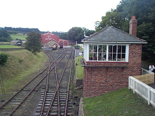 A typical North Eastern Railway station is reconstructed on the edge of the town. The station building itself came from , just a few miles from Beamish, which both originally lay on the Stanhope and Tyne Railway. The signal box came from , near Consett; the goods shed from ; and coal drops from .