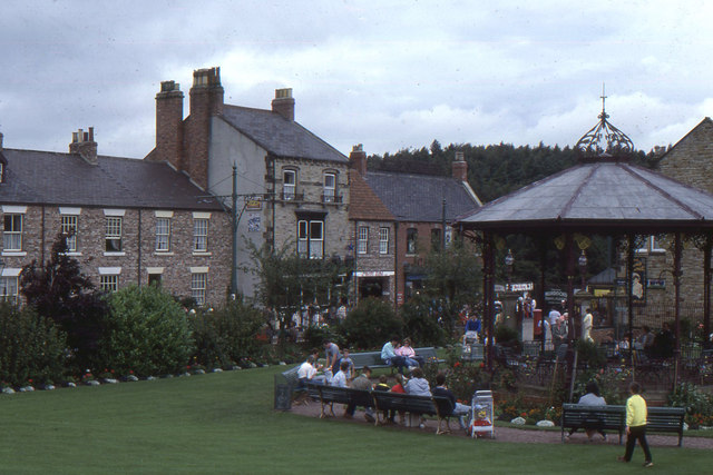 The town area, officially opened in 1985, depicts chiefly Victorian buildings in an evolved urban setting of 1913. These include the Annfield Plain Co-Operative Store (with operating cash carrier system); a terrace of "professionals"’ houses (from Gateshead), "occupied" by a music teacher, dentist's surgery and family home, and solicitor’s office; a pub (the Sun Inn from Bishop Auckland); town stables and carriage shed (utilising iron roof trusses from Fleetwood) housing an extensive collection of horse-drawn vehicles; a branch office of the Sunderland Daily Echo, stationer’s and printshop; a sweet shop and manufactory; a garage; a branch of Barclays Bank (using components from Southport and Gateshead), and a masonic temple (from Sunderland). There is a bandstand (from Gateshead) in a public park, together with drinking fountains and other examples of street furniture.