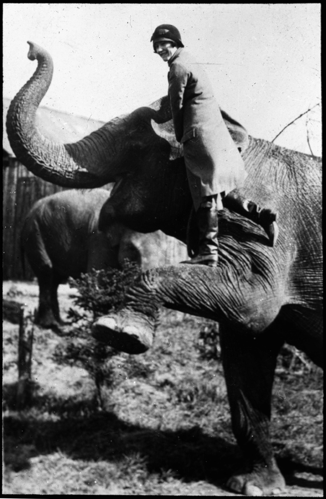 Woman standing on elephant's leg