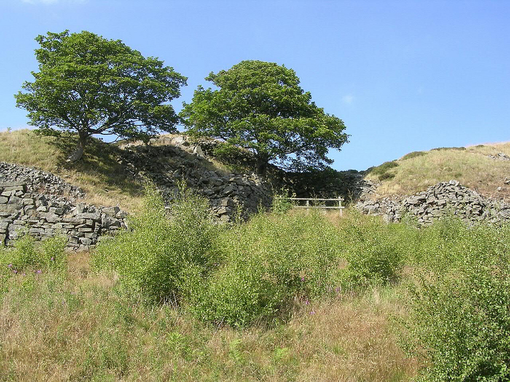 The fort had gates in the south and west walls. There may have been gates in the other walls but no sign of them has been found. The walls were of sandstone ashlar, backed by a clay bank thirty feet thick.
