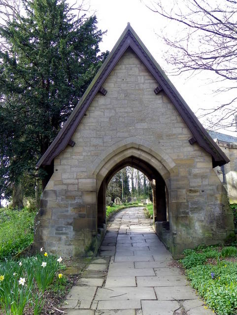 - "Lychgate. 1861. Snecked stone with Welsh slate roof. Early English style. Double-chamferd arch dying into the imposts. Steeply-pitched gable above with bargeboards and billet frieze. On left return a paired-lancet …