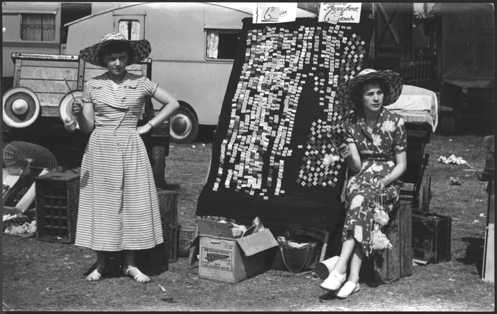 Two woman selling brooches at the Hoppings for 6d. (2 ½p in today's money). 1940's The Hoppings is a popular fair in the North East of England, held in the last full week of June every year on Newcastle's Town Moor, spanning around 40 acres of land. The Hoppings started out as a Temperance Festival in 1882, when Newcastle Temperance organisations decided to revive the annual gatherings that they had previously held, but included different festivities to coincide, to counter-attract the 'Summer Race Meeting' at Gosforth Park, which was seen as a source of drunkenness. It proved to be a great success and the fair is still being enjoyed to this very day. Ref: TWAS:944/2439 (Copyright) We're happy for you to share this digital image within the spirit of The Commons. Please cite 'Tyne & Wear Archives & Museums' when reusing. Certain restrictions on high quality reproductions and commercial use of the original physical version apply though; if you're unsure please email archives@twmuseums.org.uk. To purchase a hi-res copy please email archives@twmuseums.org.uk quoting the title and reference number. -