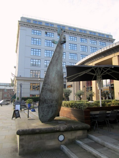 "One of two sculptures by Andrew Burton installed in 1996 flanking Keelman Square [[1415050]]. The other [[2182505]] can be seen to its left, in front of the Malmaison Hotel." Photo by Andrew Curtis, 2010. -