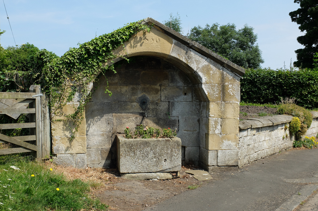 Pant dated 1859 on keystone. Squared stone with slab coping. Shouldered segmental arched recess under low-pitched gable contains tap and stone trough. -
