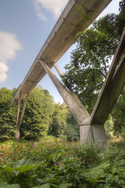 "This footbridge designed by Ove Arup was completed in 1963. It is 17 metres high and 106.7 metres long. Arup considered this bridge his finest work. He planned every detail, including the unusual way it was constructed. The need for scaffolding on the river was eliminated by casting the bridge in two halves, one for each bank. The halves were then swivelled out from the banks to meet. Concrete Quarterly described the result as "A thin, taut, white band stretching horizontally across the valley, resting on a pair of slender tapered fingers in a V-shape rising from each side of the river". http://en.wikipedia.org/wiki/Kingsgate_Bridge http://www.arup.com/Projects/Kingsgate_footbridge.aspx http://www.engineering-timelines.com/who/arup_O/arupOve9.asp" Photo by David P Howard, 2013. -
