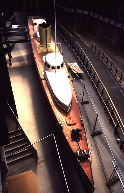"This is among the most important preserved vessels in the world. It was built by Charles Algernon Parsons in 1894 to demonstrate the use of steam turbines for marine propulsion. As built it had radial flow turbines but when Parsons regained control over his axial flow design it was fitted with a three cylinder triple expansion turbine driving three shafts, each with three propellers. The turbines developed 2100 horsepower using steam at 200 psi from a three drum water tube boiler. The stokehold was pressurised with a fan on the centre turbine shaft and at full tilt flames leapt from the funnel. Turbinia was the fastest vessel afloat and could run up to 34.5 knots (37 MPH), She made an unannounced appearance at the 1897 Spithead Review and was unstoppable. Following this there was no stopping the rise of this means of propulsion and by 1906 the Mauretania and Lusitania had turbines of 70,000 horsepower and regained the Blue Riband for England." Photo by Chris Allen, 2003. -