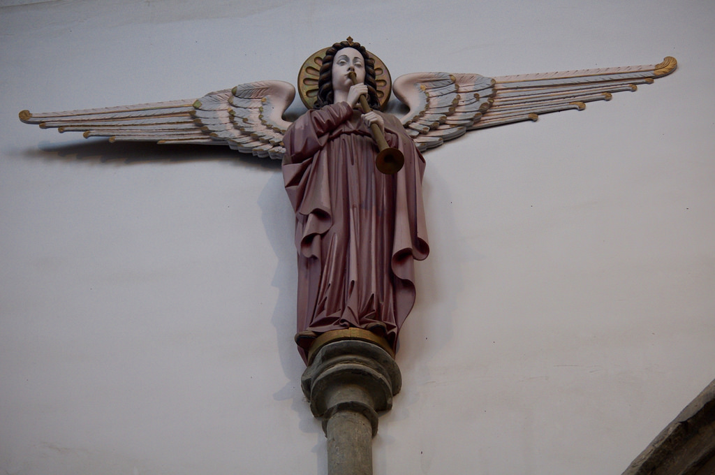 Bishop Auckland. Auckland Castle. St. Peter's Chapel. Originally the banqueting hall of the castle - built in the 12th century with external buttresses added in the 13th. The original chapel was demolished in c. 1650 and the banqueting hall was converted into the chapel, consecrated in 1665. Bishop Lightfoot made significant alterations in the period 1879-89 including the Flemish reredos, the angels and the newer stained glass. -