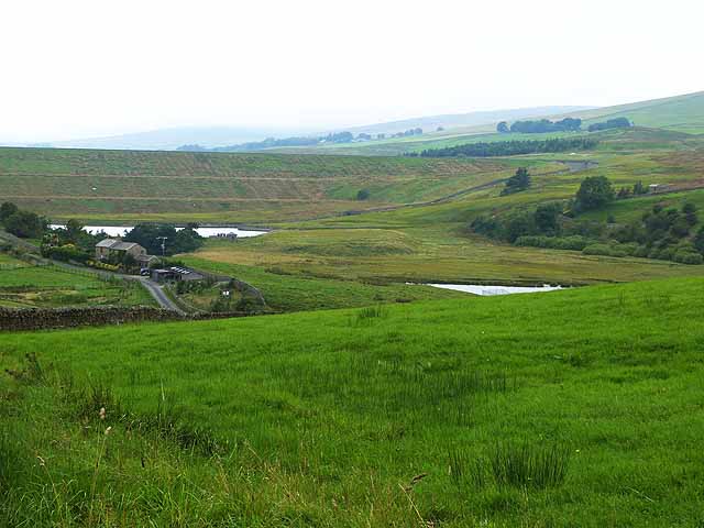"To the right is the top of the Grassholme Reservoir. Further to the left is a small lake above Selset Weir. Beyond again is the dam of the Selset Reservoir [[NY9121]]." Photo by Oliver Dixon, 2013. -