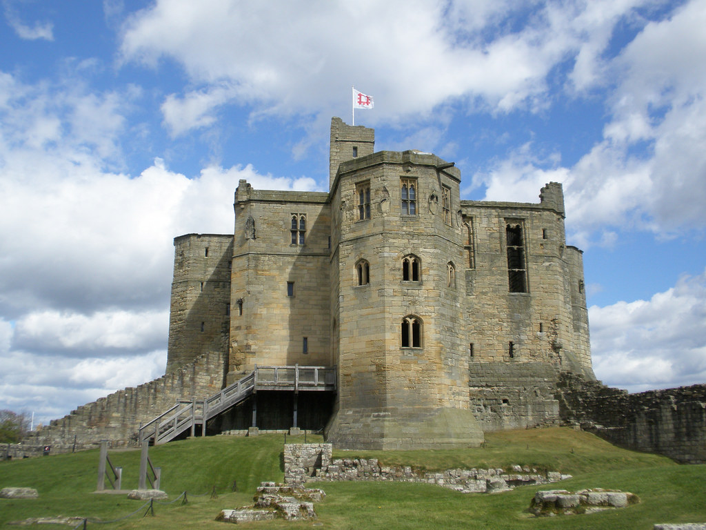 The castle and town of Warkworth occupy a naturally fortified site in a loop of the river Coquet, less than a mile from the Northumberland coast. The castle developed around two main elements – a high artificial mound, or motte, and a fortified enclosure, or bailey. A hermitage for a priest lies nearby in the surrounding park. The great tower of Warkworth Castle was commissioned by Henry Percy, 1st Earl of Northumberland, in 1377. -