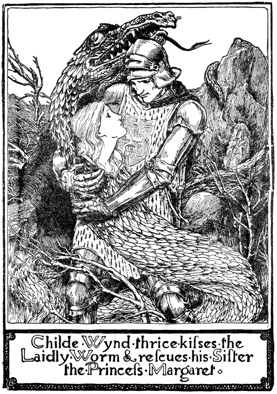 Childe Wynd thrice kisses the laidly worm, John D. Batten, 1890