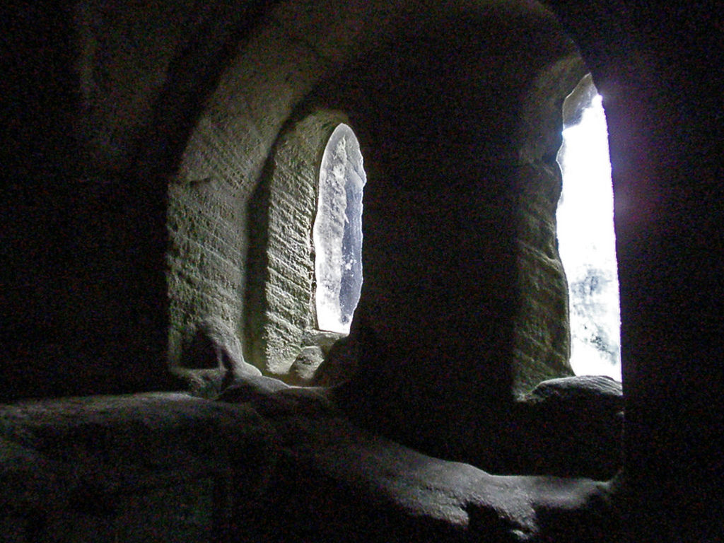 "The Hermitage is reached by boat across the river Coquet. It was almost certainly established in about 1400 by the 1st Earl. Rather than a secluded dwelling for a religious recluse (hermit), it was in fact probably a chantry, or private chapel, where a priest performed services in return for a stipend. The chapel, with three vaulted bays, was carved directly out of the rock. To the right of the altar is a cluster of worn sculptures forming an almost life-size Nativity scene. The inner chamber was probably a closet from which the earl and his retinue could view the service, as there are viewing slits and windows cut in the wall adjoining the chapel"(English Hertitage)